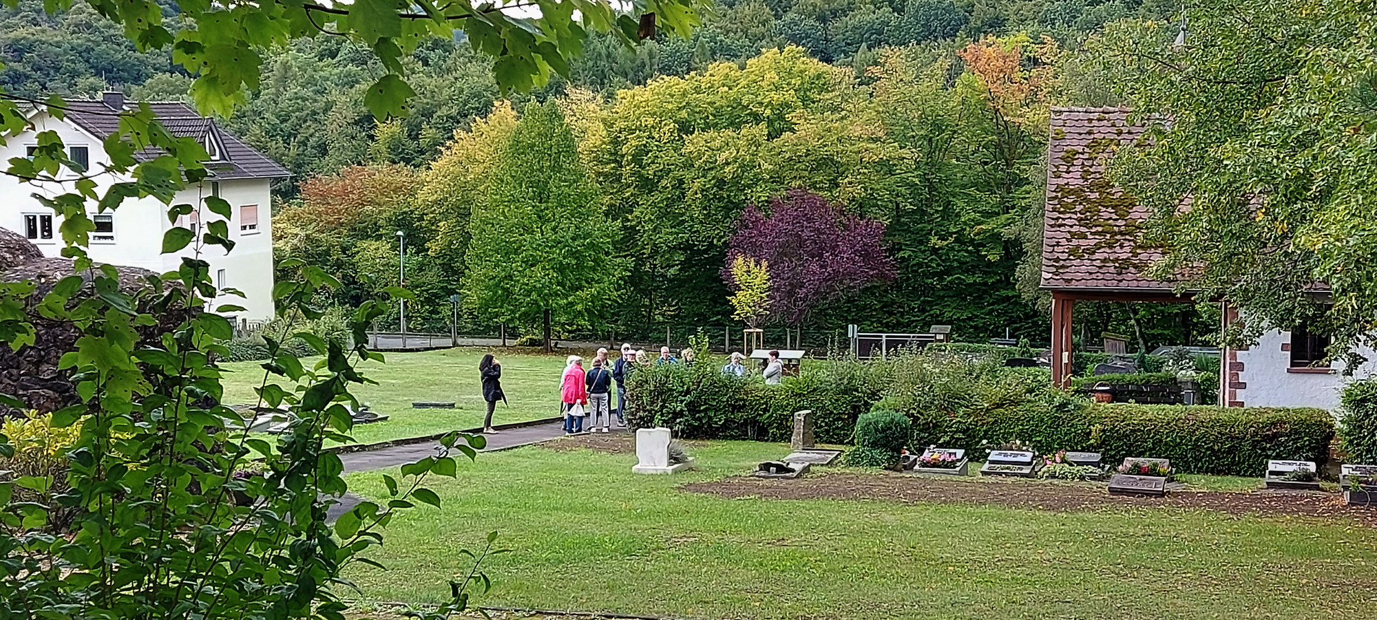 Einen Friedhof gibt es in Bieber überhaupt erst seit 1921 (obwohl man ihn seit 1867 wünschte). Er wurde damals gemeinsam mit dem Denkmal für die Gefallenen des 1. Weltkrieges eingeweiht. Frau Kerstin erzählte, dass man auf diesem Friedhof gar nicht so viele Knochen von früheren Bestattungen findet. Die Straße neben dem Friedhof heißt „Am Tagebau“. Die Knochen rutschten ab in die darunterliegenden Stollen. Leider nicht nur die Knochen. Die Flüssigkeiten, die bei der Zersetzung entstehen, flossen den Hang hinunter und kamen bei den unteren Gräbern wieder an die Oberfläche. Aus diesem Grund sind an dieser Stelle nur noch Urnengräber gestattet. In Rodheim rund um die Kirche und um die Luther-Linde sind dagegen soviele Knochen zu finden, dass man auf tausende von Beisetzungen über die Jahrhunderte schätzt.